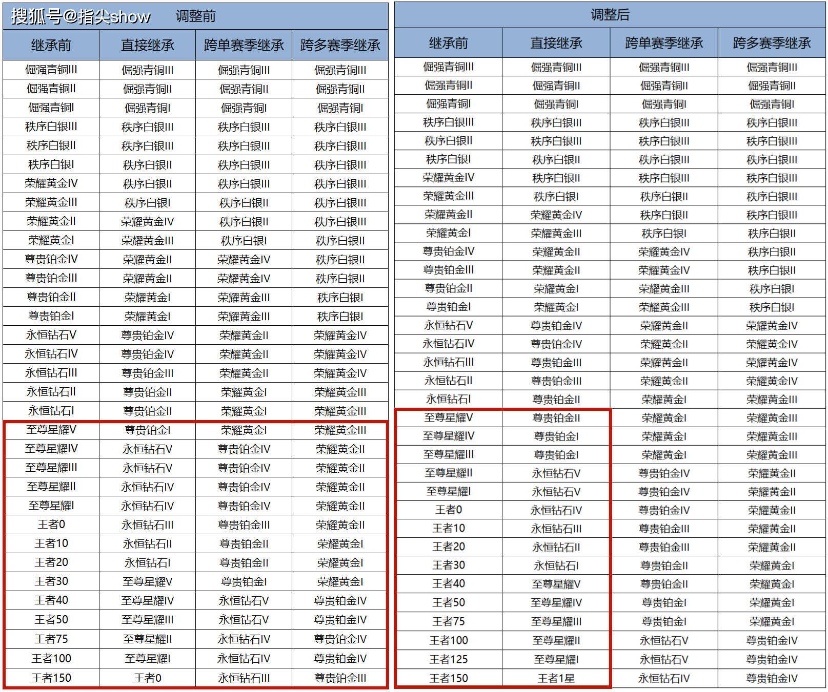新赛季的排位继承有变,从星耀到王者150星均有变化,新增了125星可继承星耀1,同时150星可以直接到王者1星,相当于有了一个掉段的保护卡。